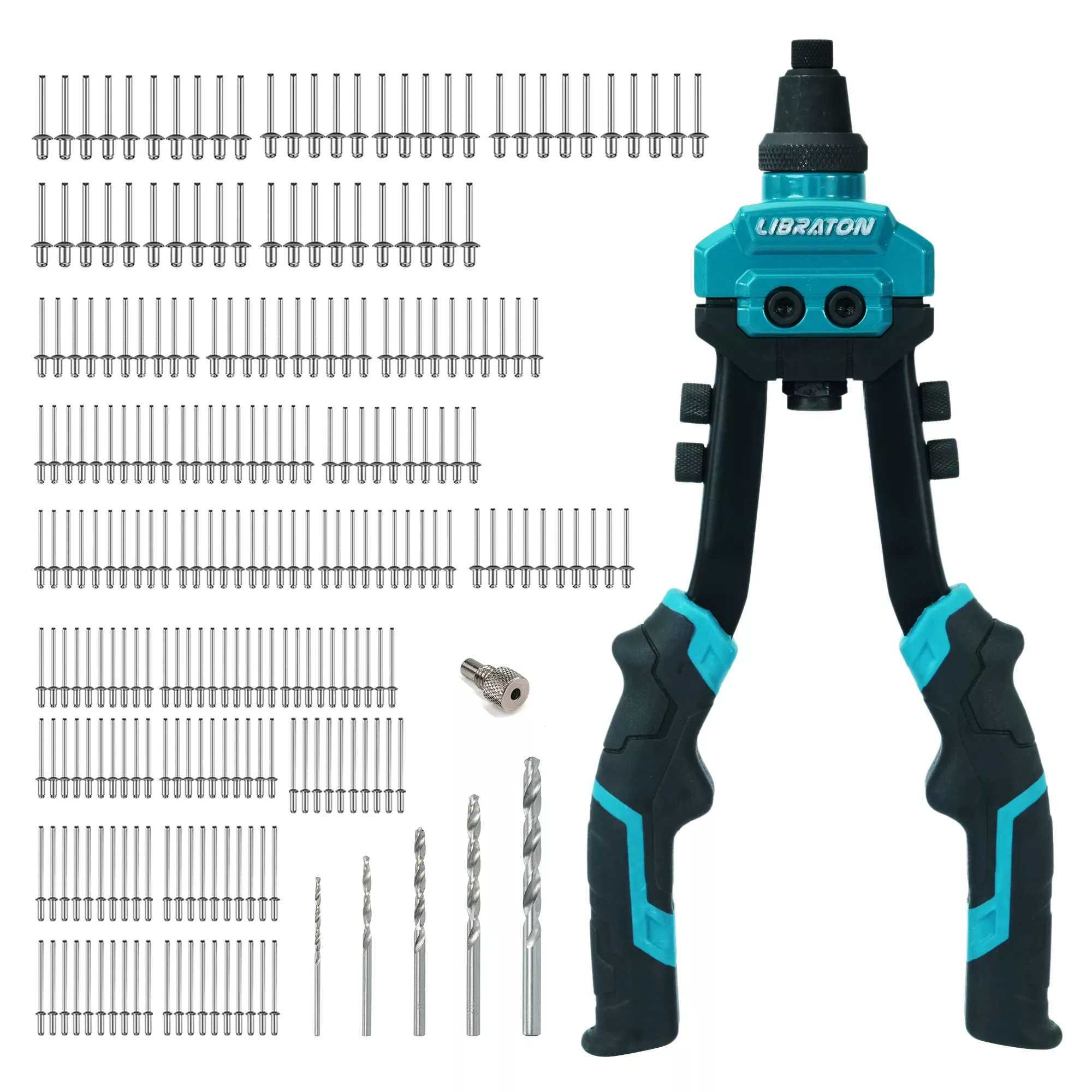 What makes this tool truly special is its ability to adapt on the fly. The 5 interchangeable nozzles (3/32″, 1/8″, 5/32″, 3/16″, and 1/4″) can be switched out without tools, making transitions fast and frustration-free. Plus, each size comes with 50 matching aluminum rivets for added convenience. A set of HSS drill bits is also included, ensuring you’re ready for any prep work that comes your way.