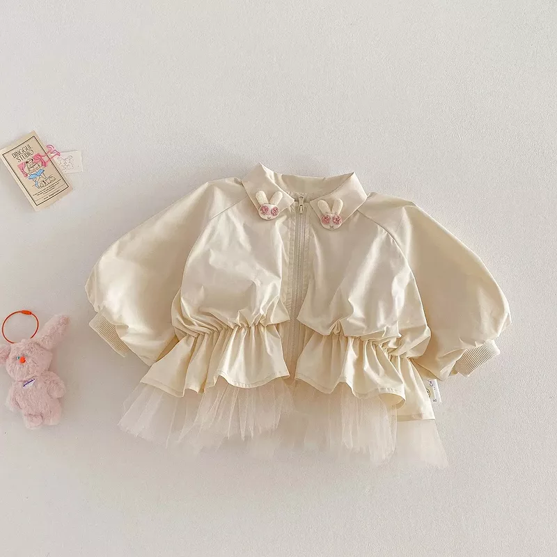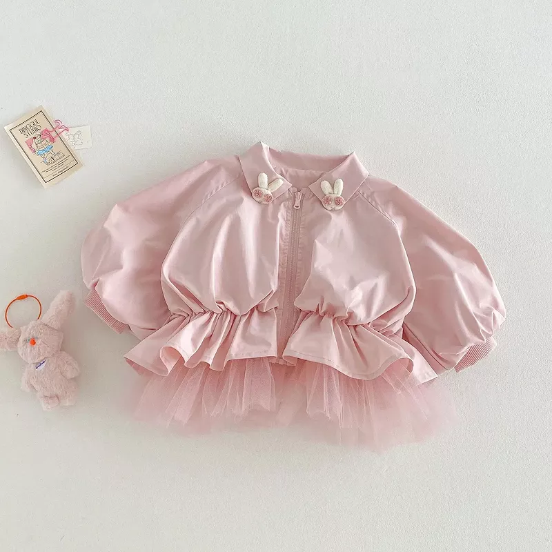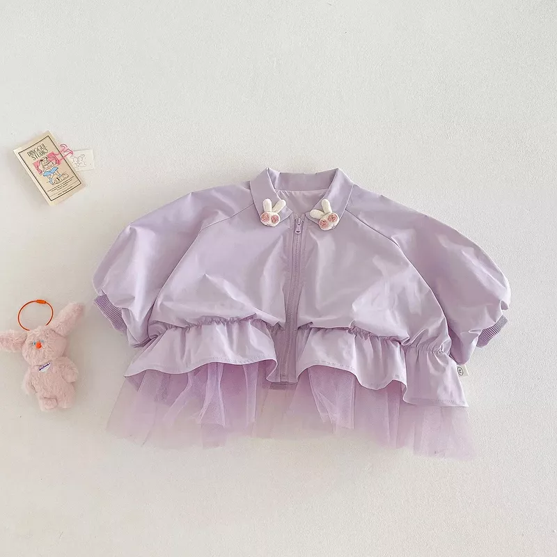 Bring a touch of charm and playfulness to your little one’s wardrobe with this stylish and cozy girls’ jacket. Designed to add a pop of style to any outfit, this jacket is perfect for spring outings, whether it’s a walk in the park or a playdate with friends. Featuring a cute bunny lapel, mesh patchwork, and a solid color design, this jacket is as fashionable as it is functional.