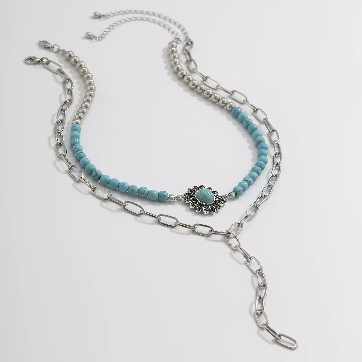 • Set of 2 necklaces: One pendant choker + one longer chain with floral blue stone charm