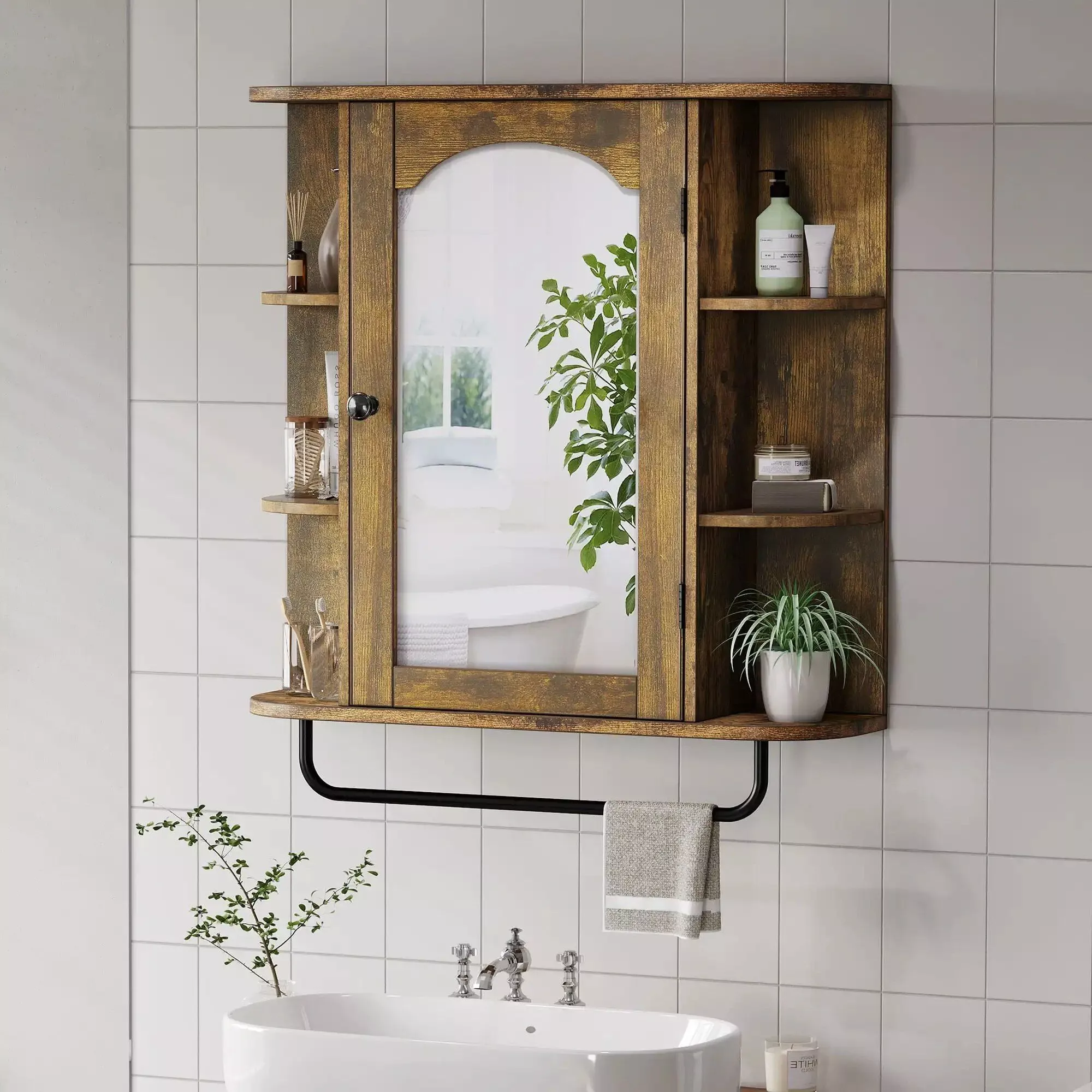 Our Wall-Mounted Brown Mirror Cabinet is best used when you need to maximize storage space without compromising on style. It’s ideal for storing toiletries in bathrooms, spices in kitchens, or accessories in bedrooms. Its versatile design makes it perfect for any room in need of extra storage and a mirror.